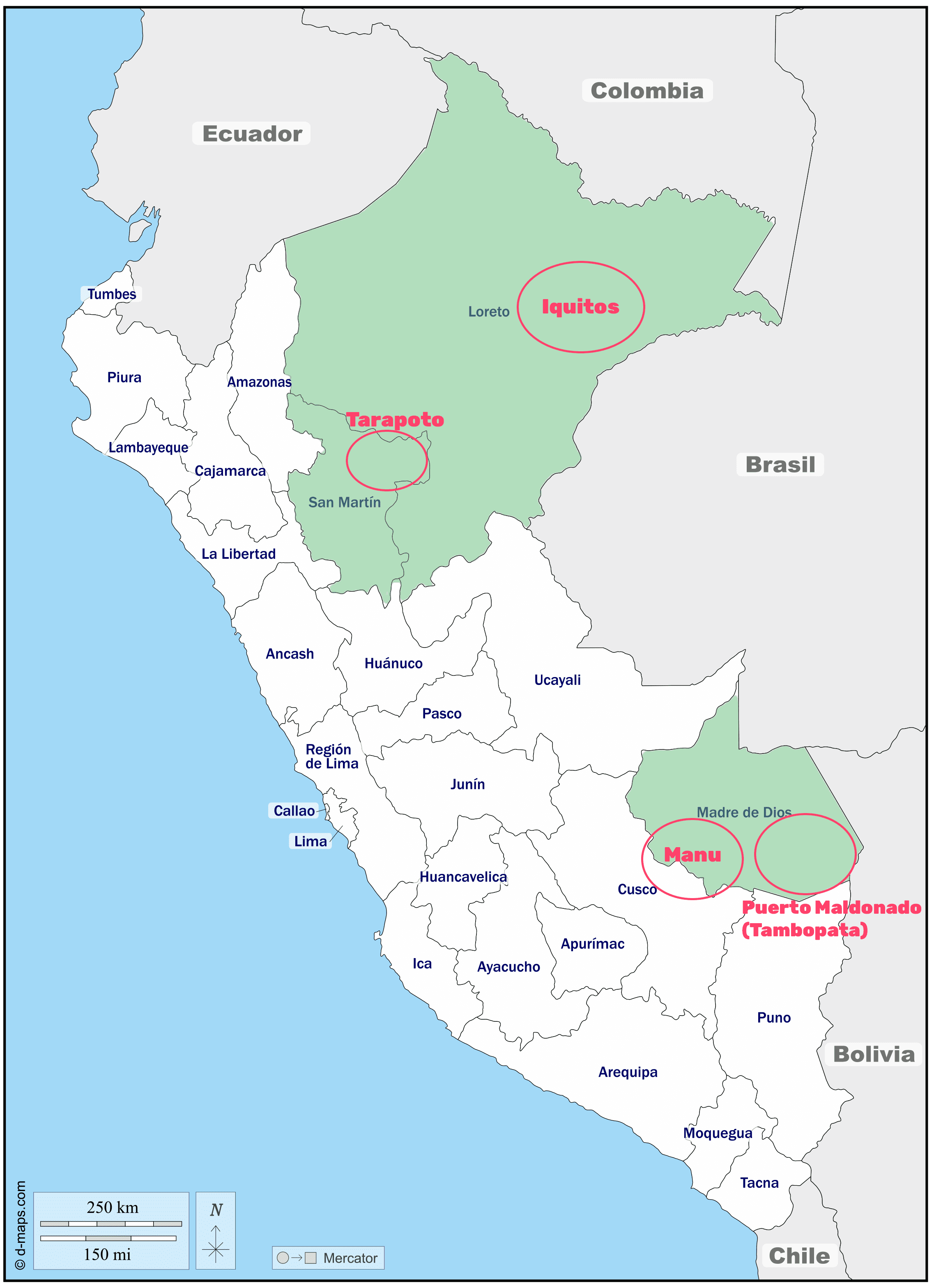 The jungle occupies around 60% of Peru’s vast territory so you will understand that there are many subdestinations here. These are sometimes very far apart and all have their own pros and cons. Some of our favourite jungle destinations in Peru are: